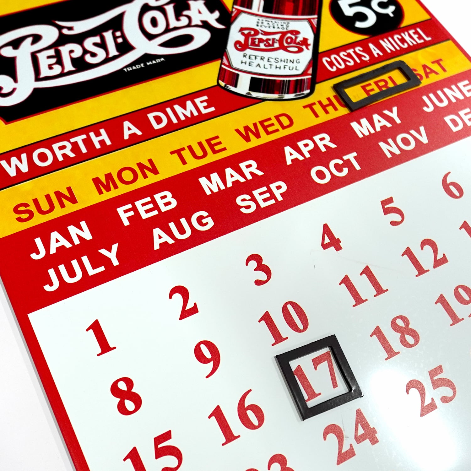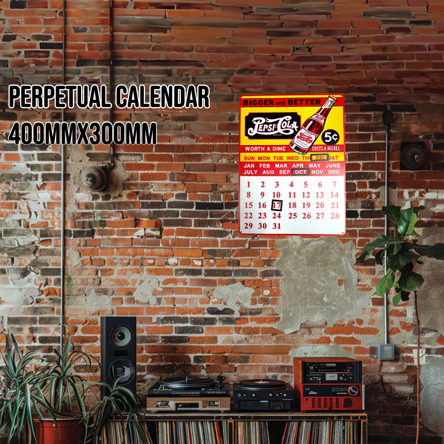 12月31日で終わるカレンダーでは無く、永久的に使えれる万年カレンダーです。曜日、月、日を囲むマグネットプレートが付いています。1日ごとにマグネットを移動する事で永久的に使えます。日付を移動するのが疲れちゃったと思っても、メタルサインとして飾っておくだけでもインテリアとしてアメリカンな雰囲気を演出します。
