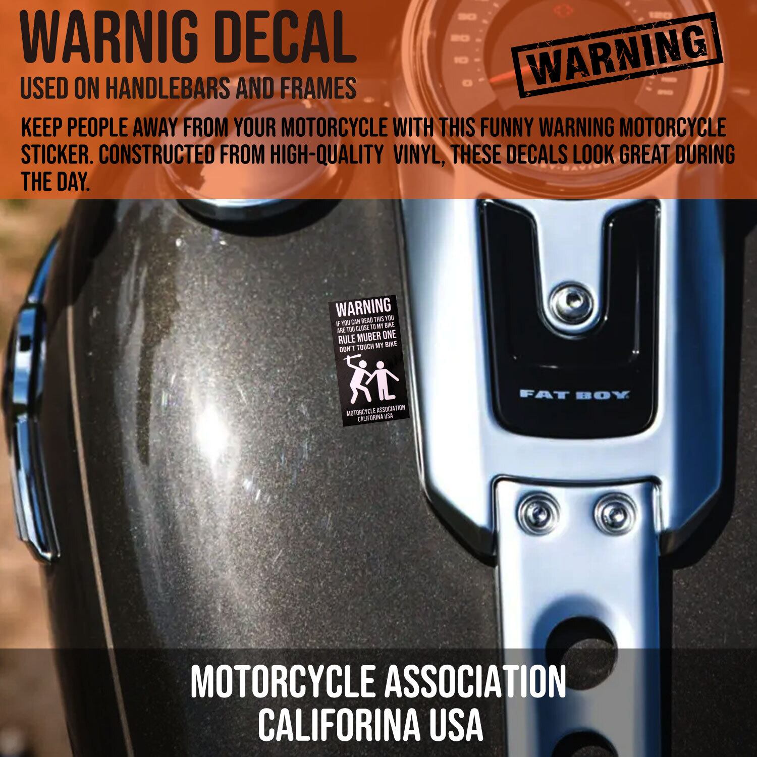 バイクや自転車などの盗難やいたずらを防止する警告ステッカーです。ヴァイオレンスなブラックジョークイラストと”if you can read this you are too close to my bike rule muber one don’t touch my bike (もしこれが読めるならあなたは私のバイクに近過ぎます。私のバイクに触れないでください)” という警告文がプリントされています。。帯状でハンドルやフレームなどにも巻いて貼る事ができます。もちろん通常のステッカーとして いろんな箇所にご使用いただけます。警告ステッカーとしての実用性だけでなくステッカーカスタムのワンポイントとしてもご活用いただけます。
