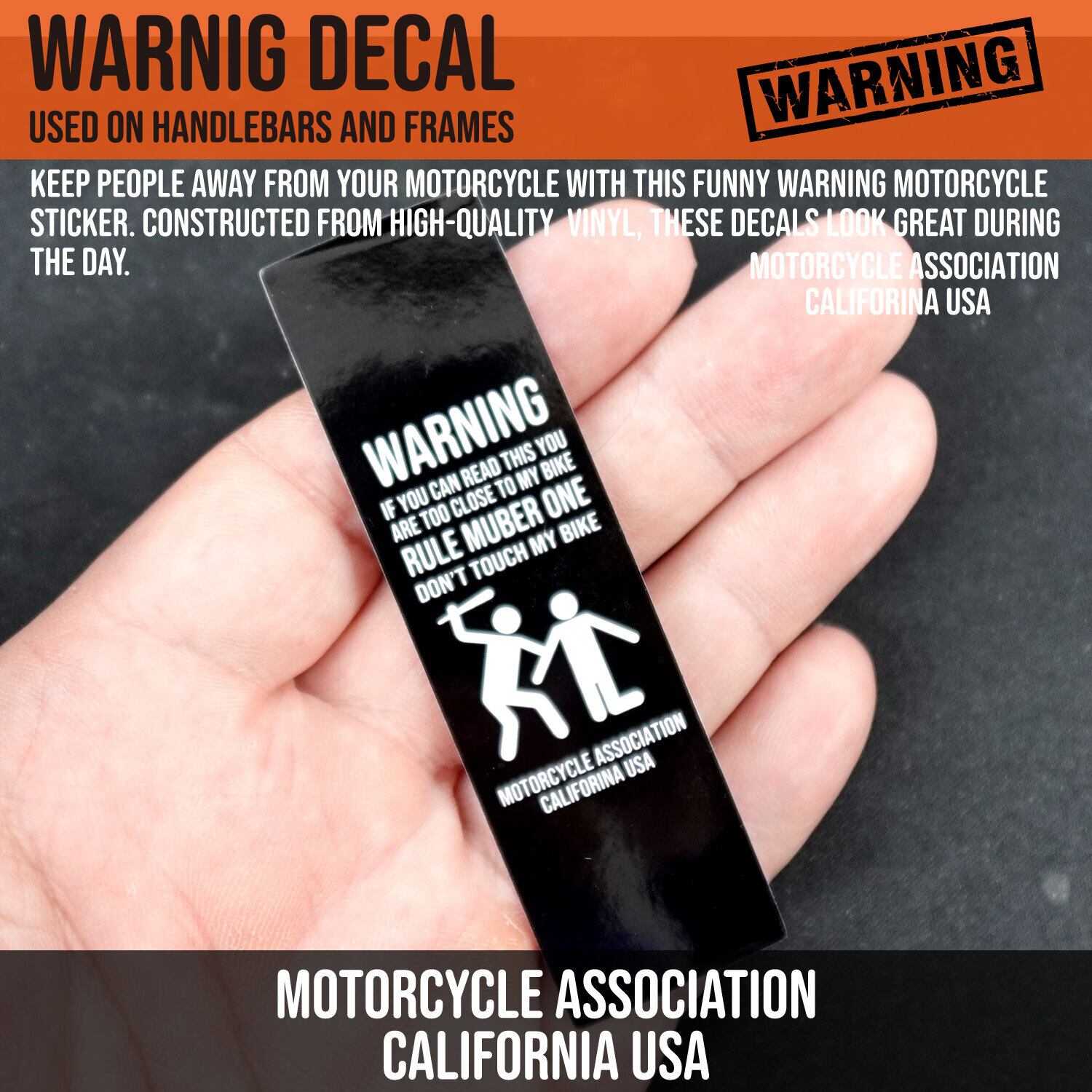 バイクや自転車などの盗難やいたずらを防止する警告ステッカーです。ヴァイオレンスなブラックジョークイラストと”if you can read this you are too close to my bike rule muber one don’t touch my bike (もしこれが読めるならあなたは私のバイクに近過ぎます。私のバイクに触れないでください)” という警告文がプリントされています。。帯状でハンドルやフレームなどにも巻いて貼る事ができます。もちろん通常のステッカーとして いろんな箇所にご使用いただけます。警告ステッカーとしての実用性だけでなくステッカーカスタムのワンポイントとしてもご活用いただけます。