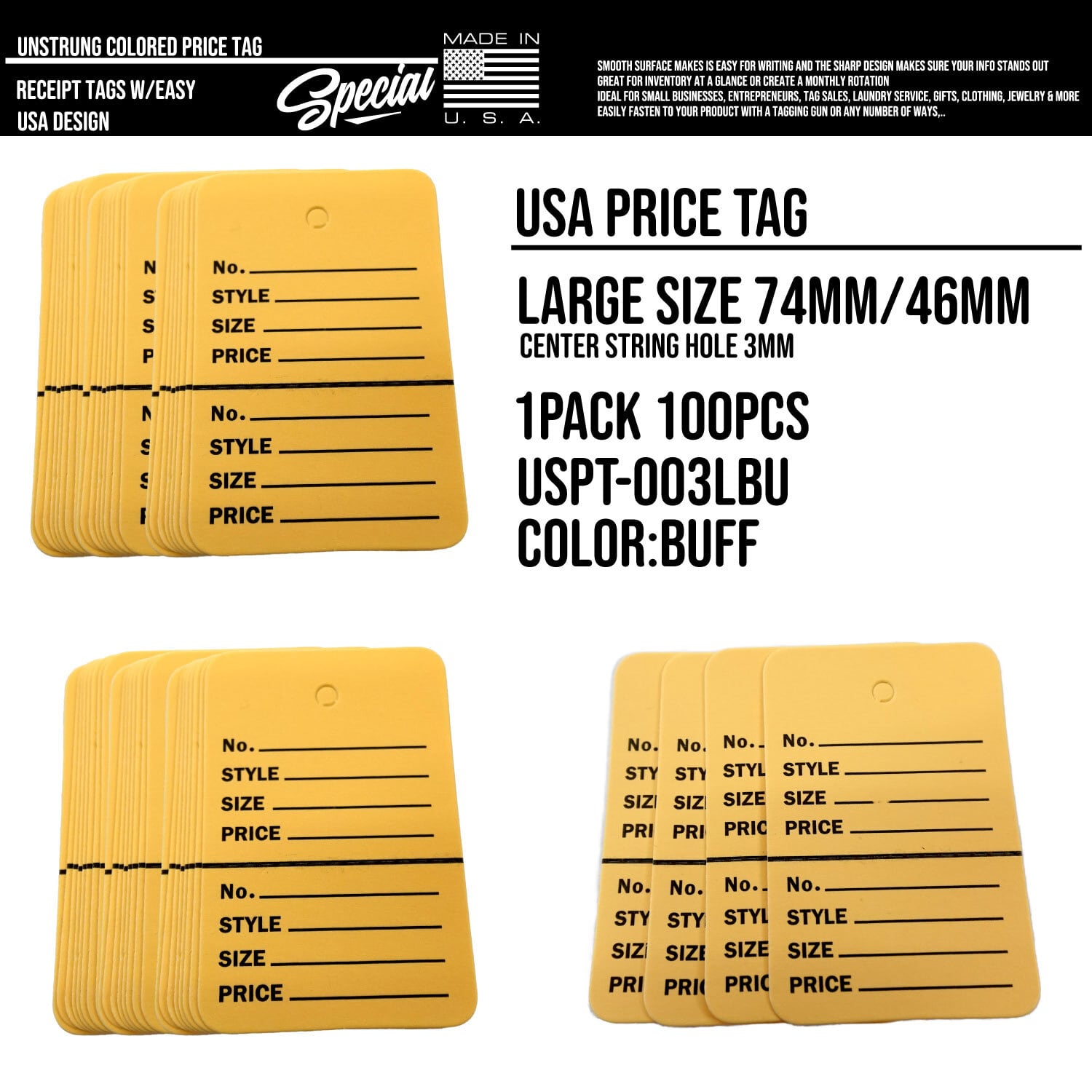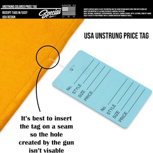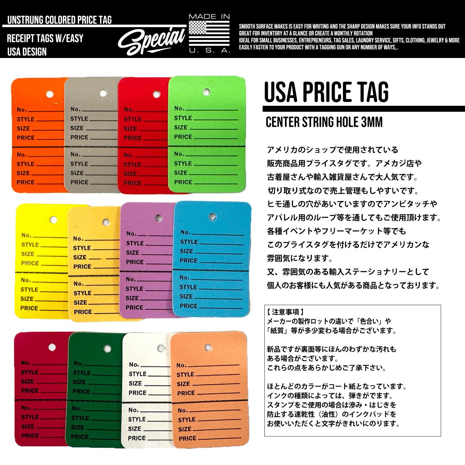 アメリカのショップで使用されている販売商品用プライスタグです。アメカジショップさんや古着屋さんや輸入雑貨店さんで人気です。切り取り式なので売り上げ管理もしやすいです。紐通しの穴があいてますのでアンビタッチやアパレル用のループやタグガンなどを通してもご使用いただけます。各種イベントやフリーマーケット等でもこのプライスタグをつけるだけでアメリカンな雰囲気を演出できます。また、雰囲気のある輸入ステーショナリーとして個人のお客様にも人気のある商品となっております。