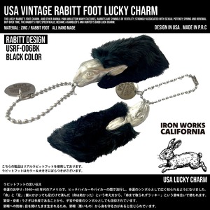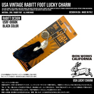 不思議な力が宿るとされる“ウサギの後ろ足(足先)”に留め具を取り付けお守りとして加工したキーチェーンです。アメリカやイギリス、メキシコなどで人気が高く、1940年代 - 1960年代にアメリカのヒッチハイカーやバイカーたちの間で流行したお守りです。